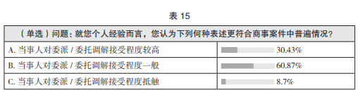 笔者认为,就调解统一立法而言,将包括商事调解在内的各类调解活动纳入调解统一立法符合普遍的社情民意。虽然商事调解在2009年才首次出现在我国有关多元解纷体系的官方文件之中,但自清末民初以来,其作为一种纠纷解决方式已经稳定存在,历经四个主要阶段的发展后早已融入中国商业社会的方方面面,并源源不断地为我国商事争议的解决注入和谐的力量。即便我国商事调解的市场化、国际化发展还存在许多困难,即便案源、费用等生存障碍仍然存在,但是许多法律、经贸领域的从业人员投身商事调解工作,对商事调解行业抱有极高的期待与热情,并对调解发展的前景表示乐观。实务界对调解事业的热情和期待也可以从本文所涉调研结果得到印证。