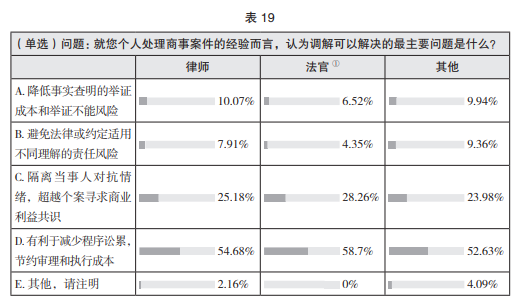 结合针对全部律师、公司法务、法官对调解认知度的调研结果,可以看到,无论相关主体调解经验如何,相对多数的人员均认为调解理念和技巧是当下我国调解行业需要进一步加强宣传和推广的事项(见表18);相对多数的人员也均认为调解行业整体发展有利于减少程序讼累,节约审理和执行成本(见表19)。