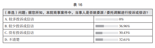 在法院日常涉及较多的委派、委托调解工作中,当事人对该种调解程序的接受程度仍有所保留(见表15),且实际调解服务的质量也存在一定的提升空间(见表16)。