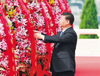 9月30日上午,习近平、李克强、栗战书、汪洋、王沪宁、赵乐际、韩正、王岐山等党和国家领导人来到北京天安门广场,出席烈士纪念日向人民英雄敬献花篮仪式。这是习近平整理花篮上的缎带。 |