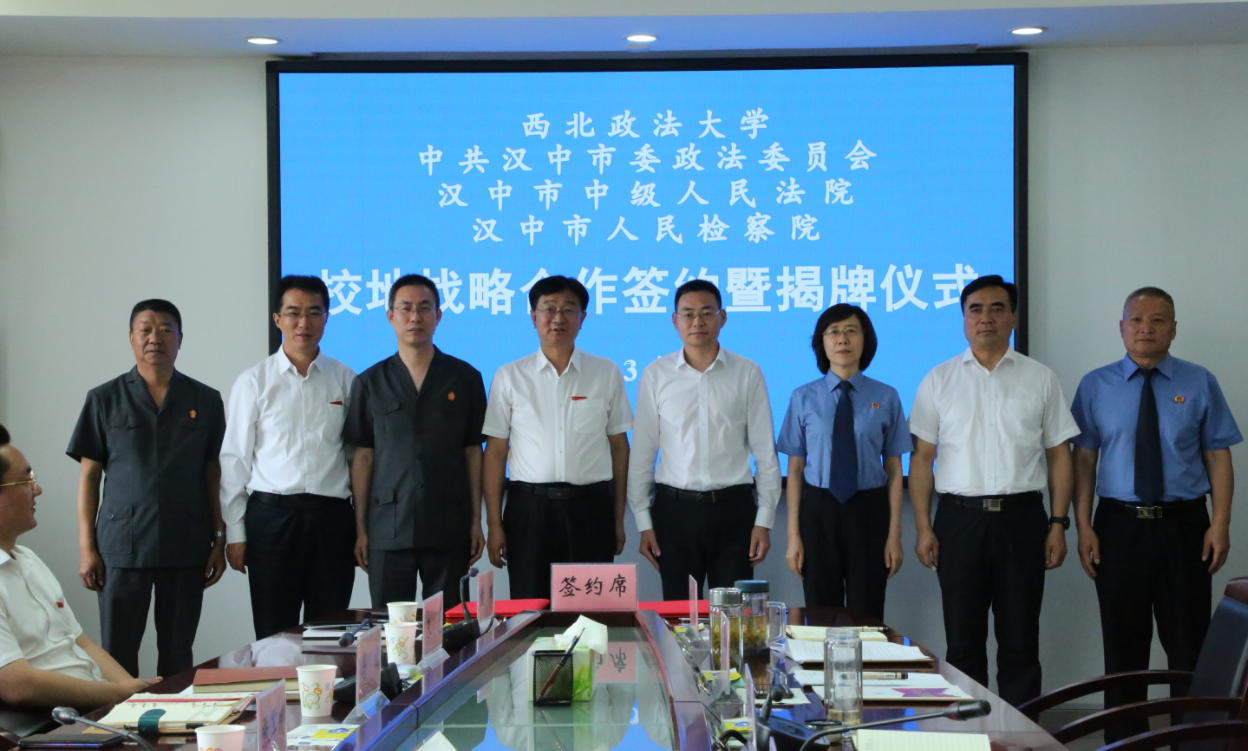 上午,范九利一行到汉中市人民检察院,与汉中市委政法委、市中级人民法院、市人民检察院签订战略合作框架协议,为市中级人民法院“研究生实践教学基地”“马锡五审判方式与人民司法优良传统教学科研实践基地”、市人民检察院“研究生实践教学基地”揭牌,并开展座谈交流。汉中市委常委、组织部部长、政法委书记王利主持,市中级人民法院院长高延文、市人民检察院检察长惠春霞出席会议。
