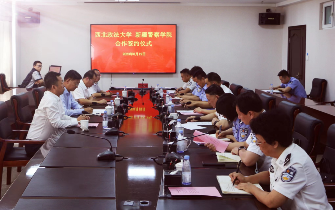 在新疆警察学院,范九利一行与党委副书记、院长宋国庆,党委委员、副院长巢锡辉等相关领导和部门负责人,围绕人才培养、项目合作、课题研究、学术共建、资源共享等进行了热烈交流。范九利表示,两校合作协议的签署,将进一步推动两校在学科专业建设、教师队伍建设和科学研究水平等方面开展全方位、立体化、多层次交流合作,促进双方教育教学高质量发展,是落实第三次中央新疆工作会议精神和党中央关于教育和公安工作部署要求的务实举措。